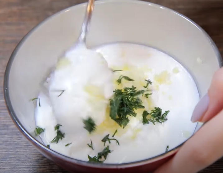 - Для заправки делаем соус из сметаны, чеснока и зелени.