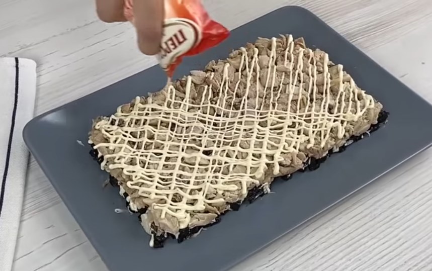 - Следующим слоем закладываем куриное мясо, равномерно распределяем и также делаем сеточку из майонеза.