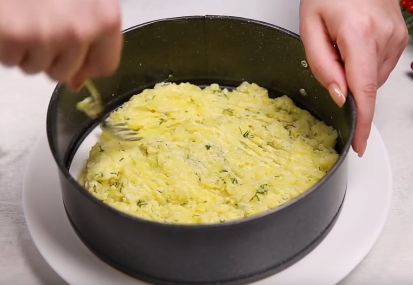 - Для сборки салата берем разъемное кольцо, ставим на тарелку и первым слоем укладываем картофель.