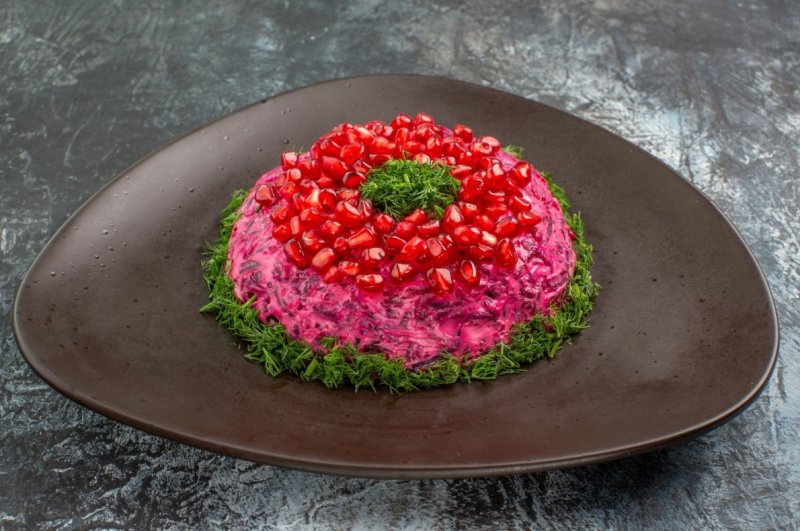 Овощи отварить и натереть. Нори измельчить – они дадут нужный морской вкус. Выкладывать слоями: картофель, нори с майонезом, морковь, свекла. Салат выглядит классически, но полностью растительный.