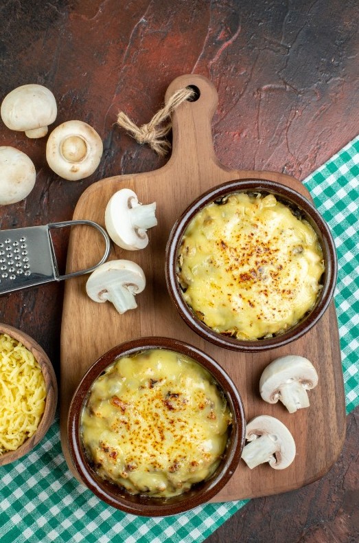 Грибы и лук обжарить до золотистости. Кешью взбить с водой, дрожжами, горчицей и солью до кремовой текстуры. Соединить с грибами, разложить по формам и запекать 15–20 минут при 180 °C. Соус дает тот самый "жульеновый" эффект без сливок и сыра.