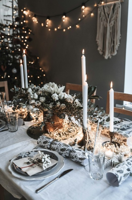 Для тех, кто устал от традиционного новогоднего декора, подойдет минималистичный сценарий. Белая или светло-серая посуда, прозрачное стекло, простые формы – и один выразительный цвет.
