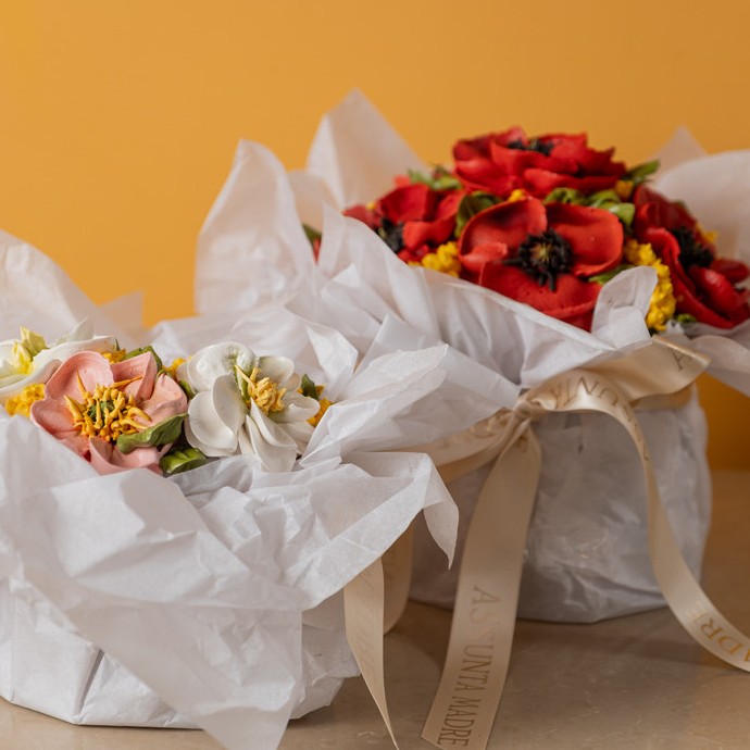 В Assunta Madre остаются в рамках классики, но добавили итальянские акценты. Сдобное тесто, пропитанное ромом и ванилью, дополнили орехами и цукатами – вкус получился плотным и сбалансированным. За оформление отвечает шеф-кондитер Бек Караев: кулич покрывают сахарной помадкой и украшают зефирными цветами в форме маков.