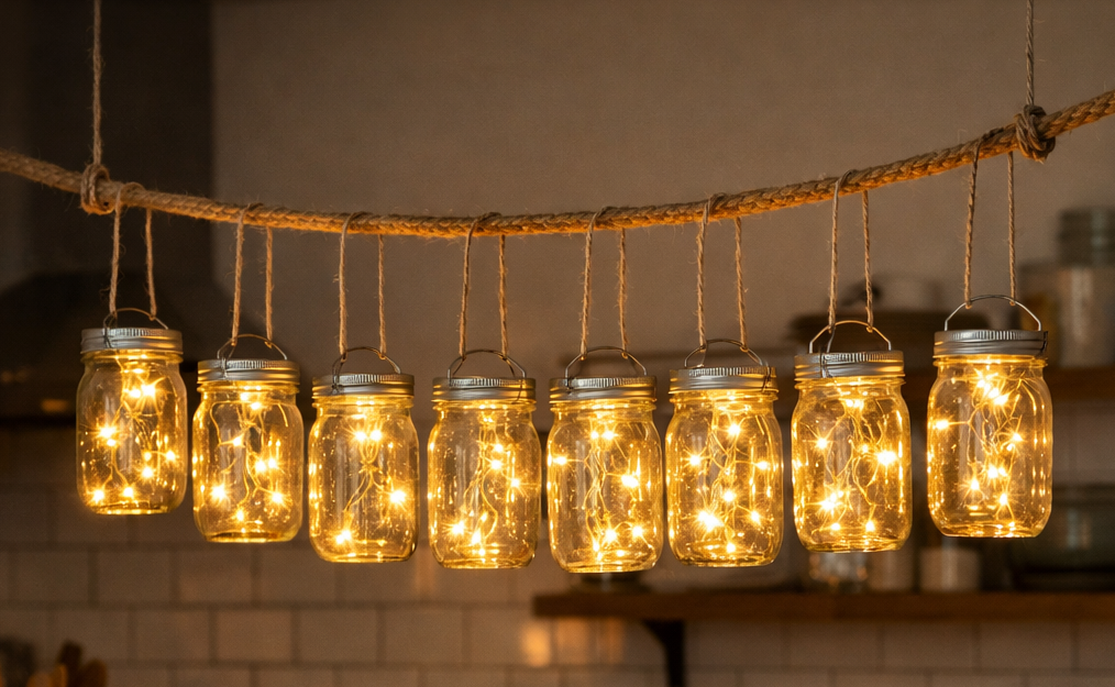 Возьмите 8–10 небольших одинаковых стеклянных банок, проденьте гирлянду с теплыми LED-лампочками или поставьте внутрь мини-свечки в металлических стаканчиках. Установите над кухонным островом или обеденным столом. Днем банки пустые и прозрачные – легкий акцент. Вечером они превращаются в волшебные фонарики, создающие атмосферу кафе на вашей кухне.